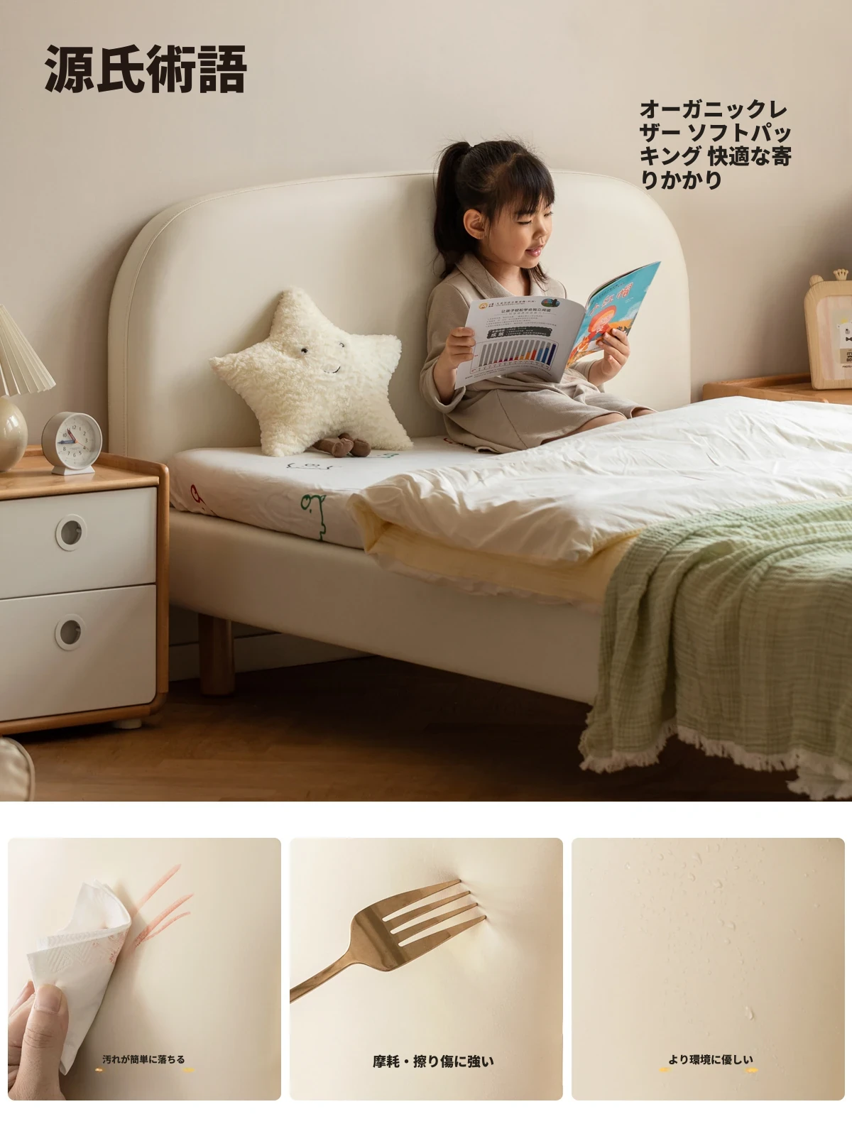 源氏木语子供用無垢材ベッド・オーガニックレザーのソフトヘッドボード付き・男の子・女の子向け1.2mシングルベッド【安心の天然素材使用】