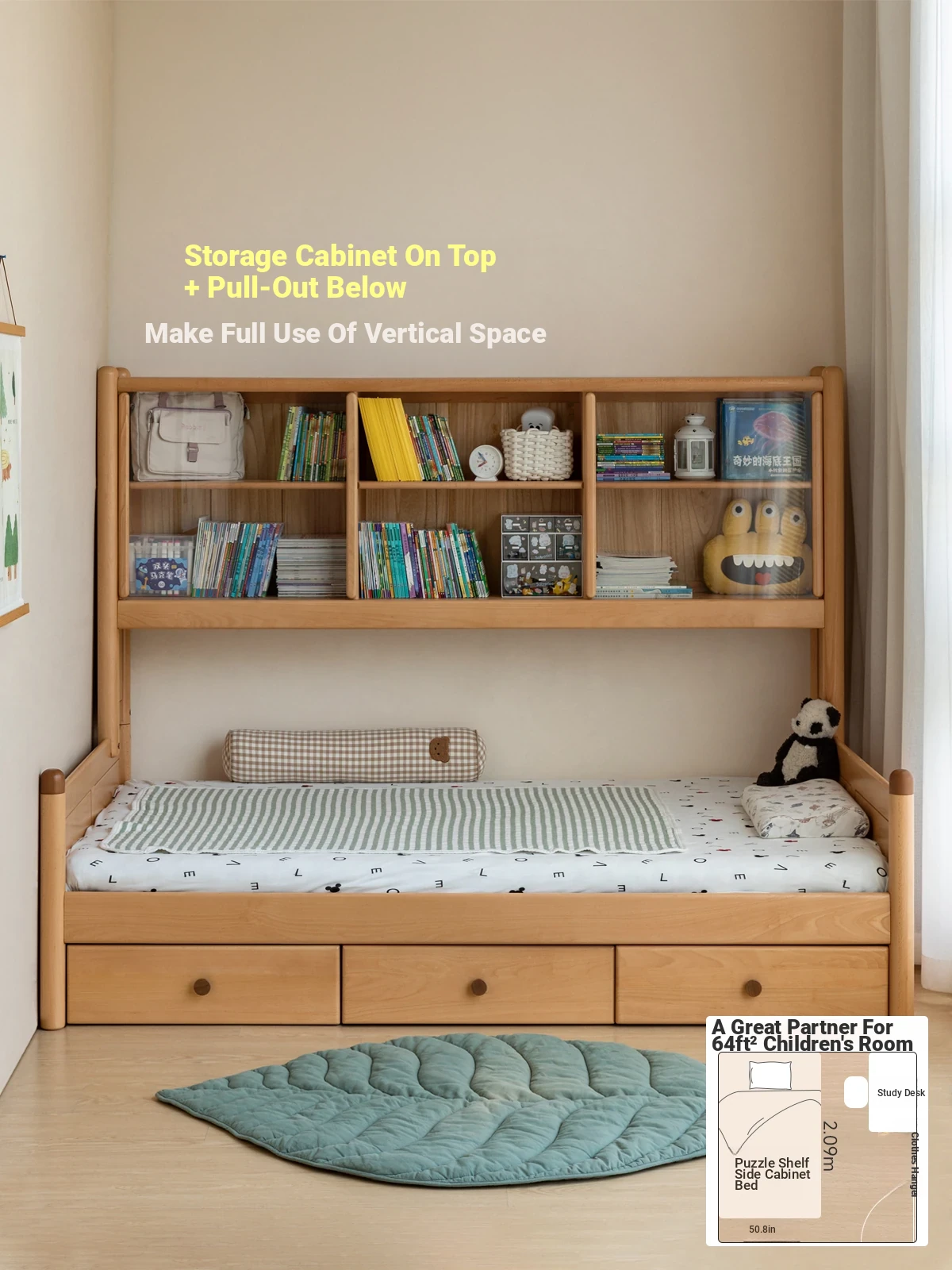 Genji Mu Yu Kids Solid Wood Bed with Integrated Storage Cabinet - Minimalist Design for Small Spaces, Perfect for Boys and Girls' Bedrooms