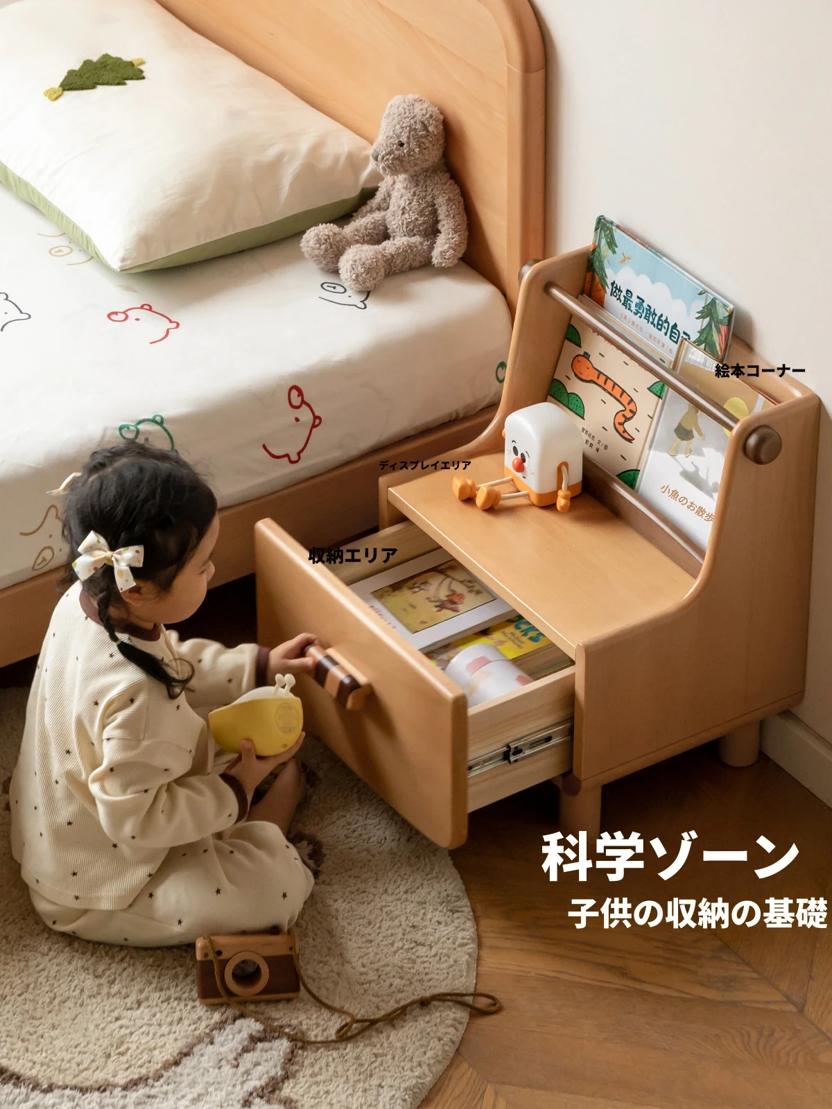 源氏木語の全木製ナイトテーブル|シンプルで現代的なデザイン|コンパクトで便利な多機能型の子供用収納キャビネット|お部屋をおしゃれに演出!