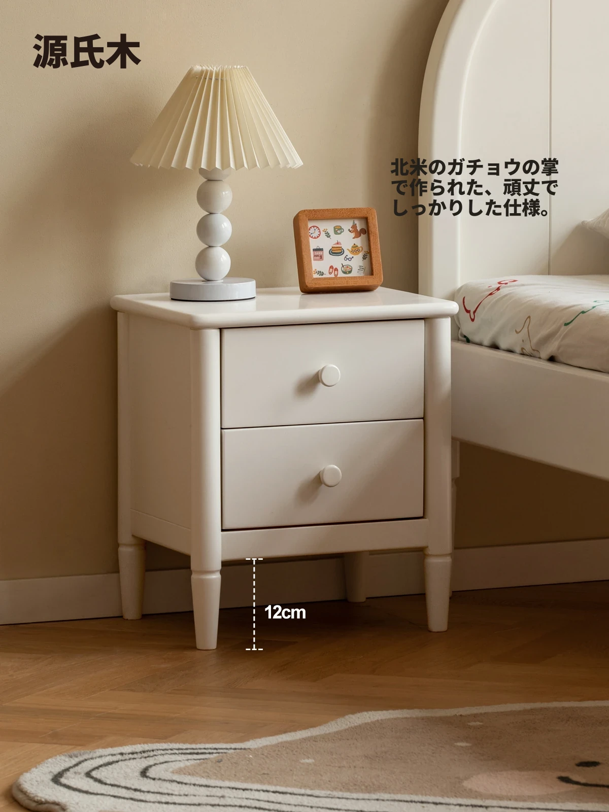 源氏木语の子供用無垢材ベッドサイドキャビネット - ホワイトのミニ収納家具で、お部屋をスッキリ整理!シンプルでおしゃれなデザイン、収納力抜群のサイドテーブル。お子様の夢を育む空間を演出します!