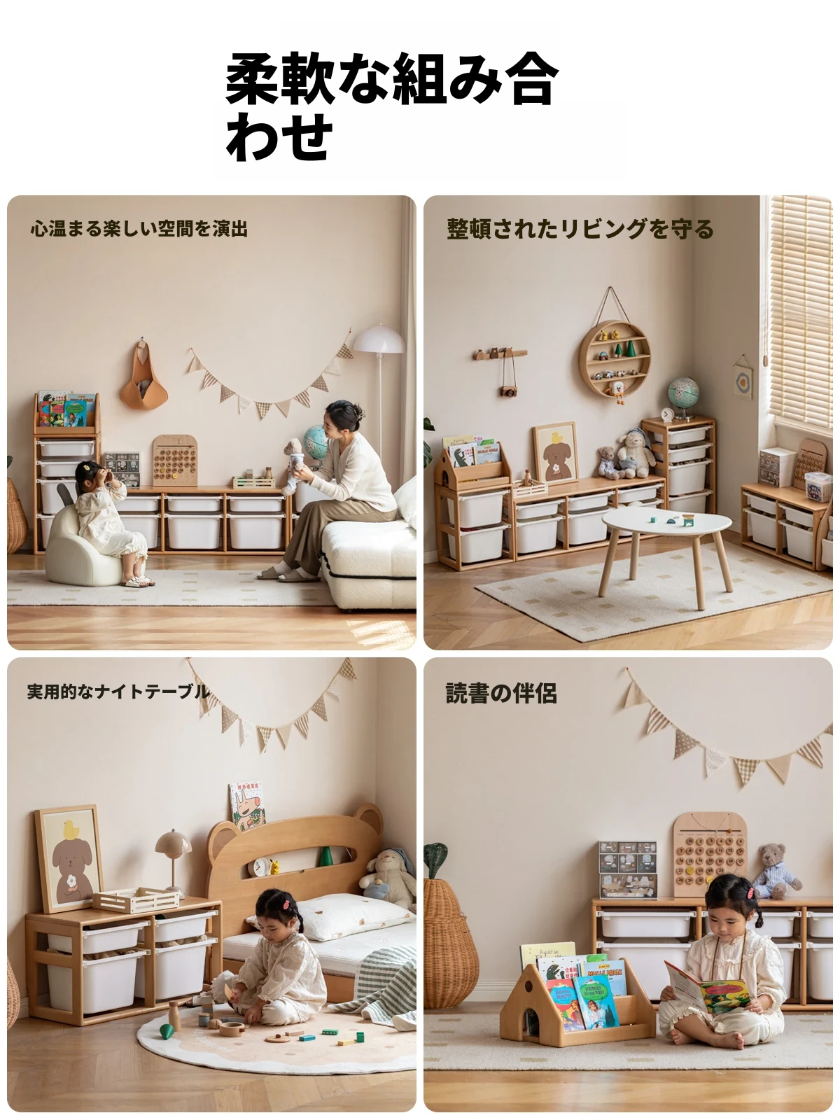 天然木製のコンビネーション収納棚 - 家庭用の読書やおもちゃ整理にぴったり!シンプルでおしゃれなデザイン、子供部屋やリビングに最適です。心地よい空間作りをサポートします!