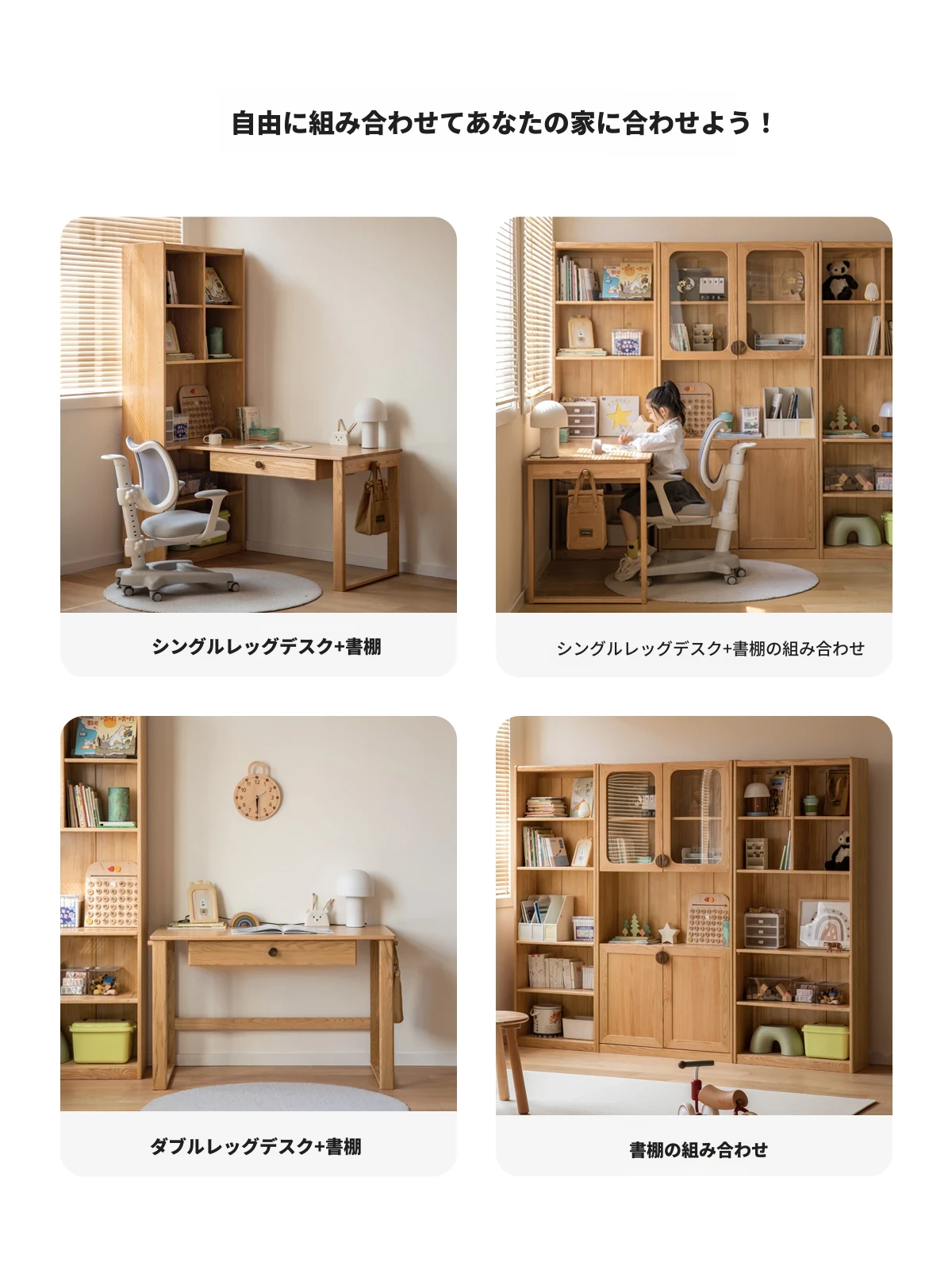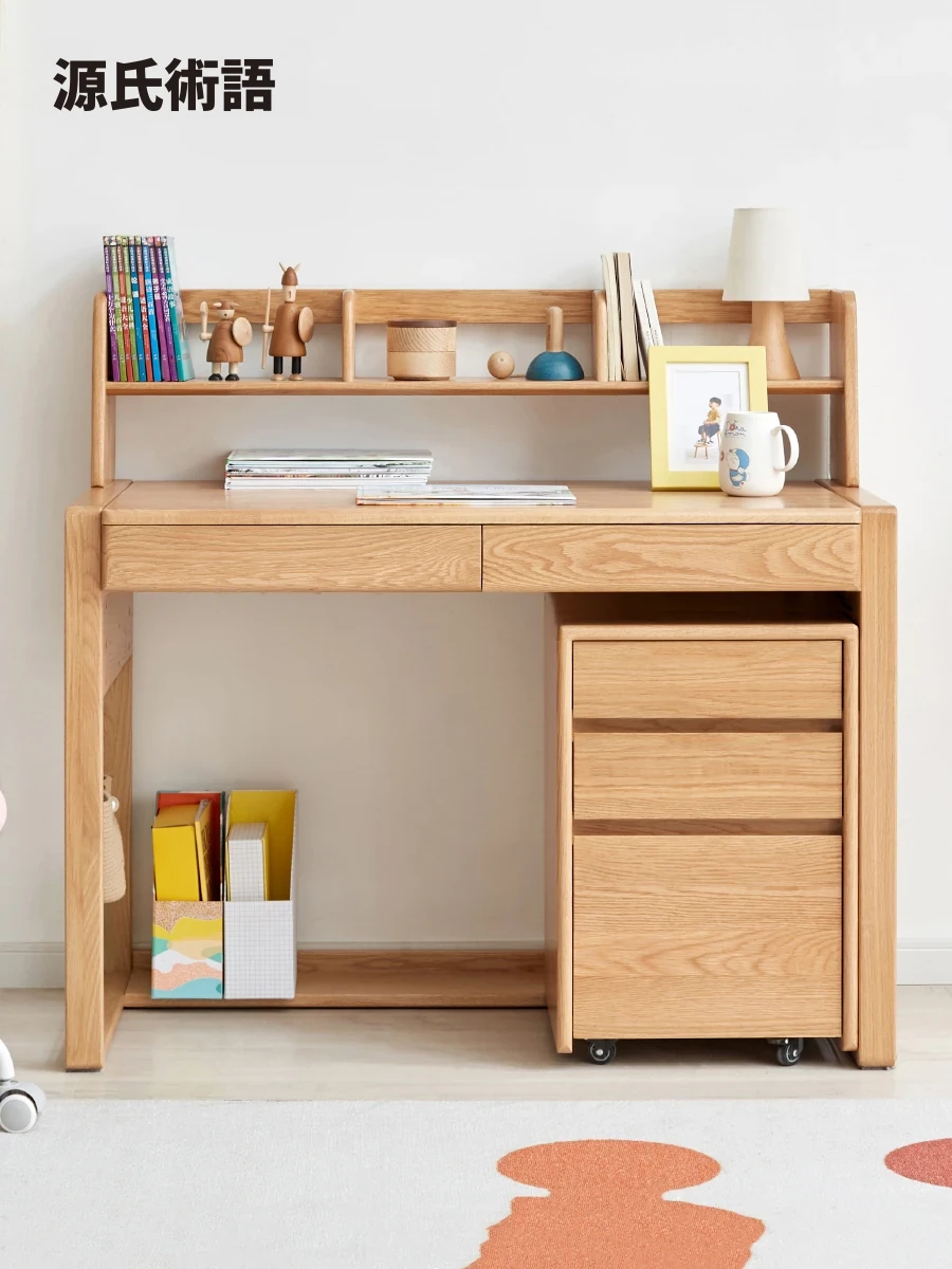 源氏木語 子供用 無垢材 書棚 家庭用 コンビネーション デスク&キャビネット 白色 本棚 学生向け 読書絵本ラック シェルフ 収納力抜群でお部屋をスッキリさせる!