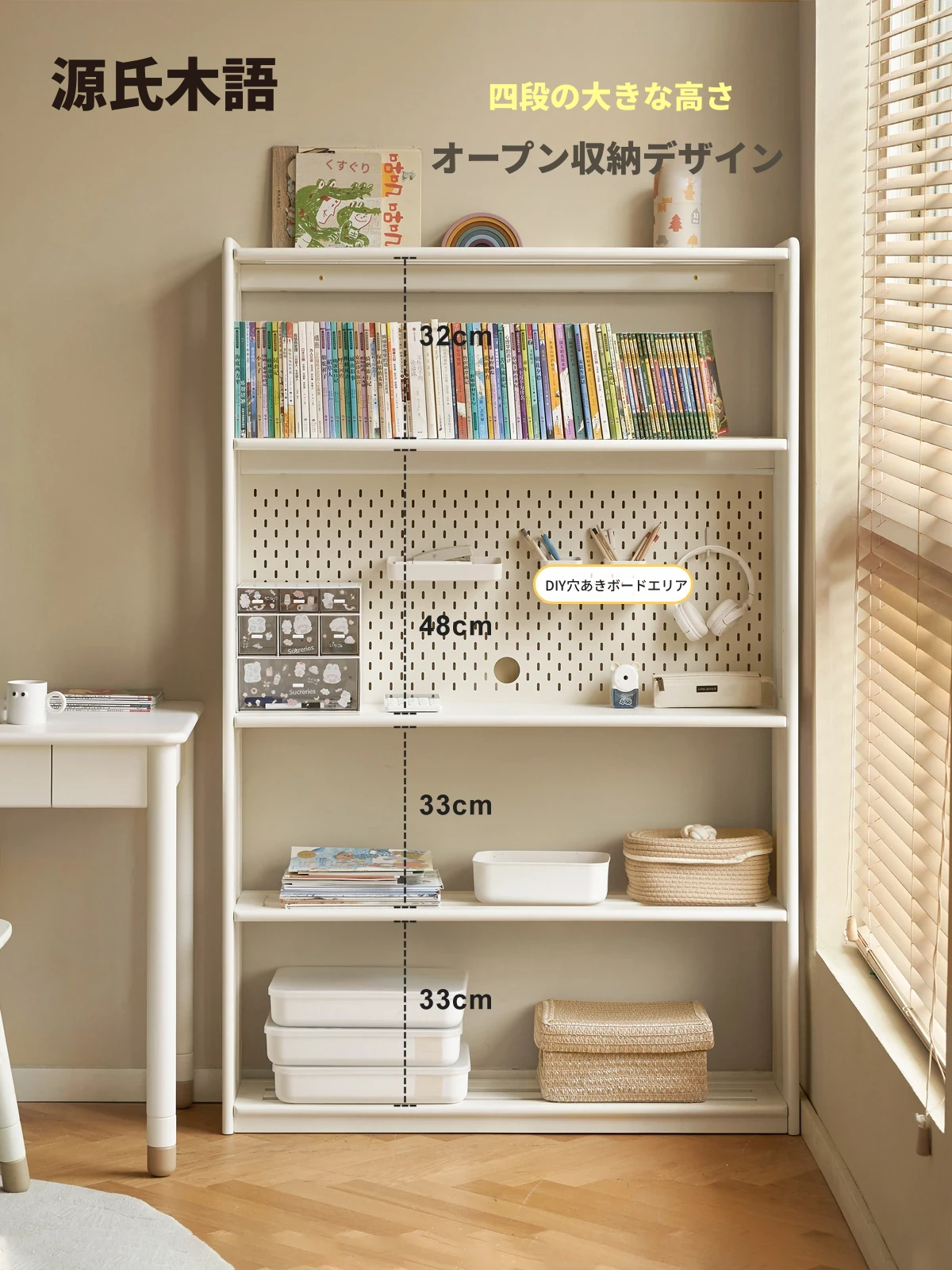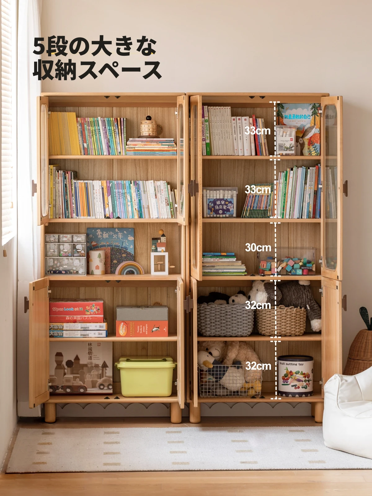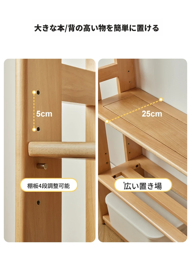 源氏木语の子供用書棚 - 北欧スタイルのシンプルでおしゃれな収納キャビネット、大容量の無垢材製、使いやすいゾーン分け収納でお部屋をスッキリ整理!