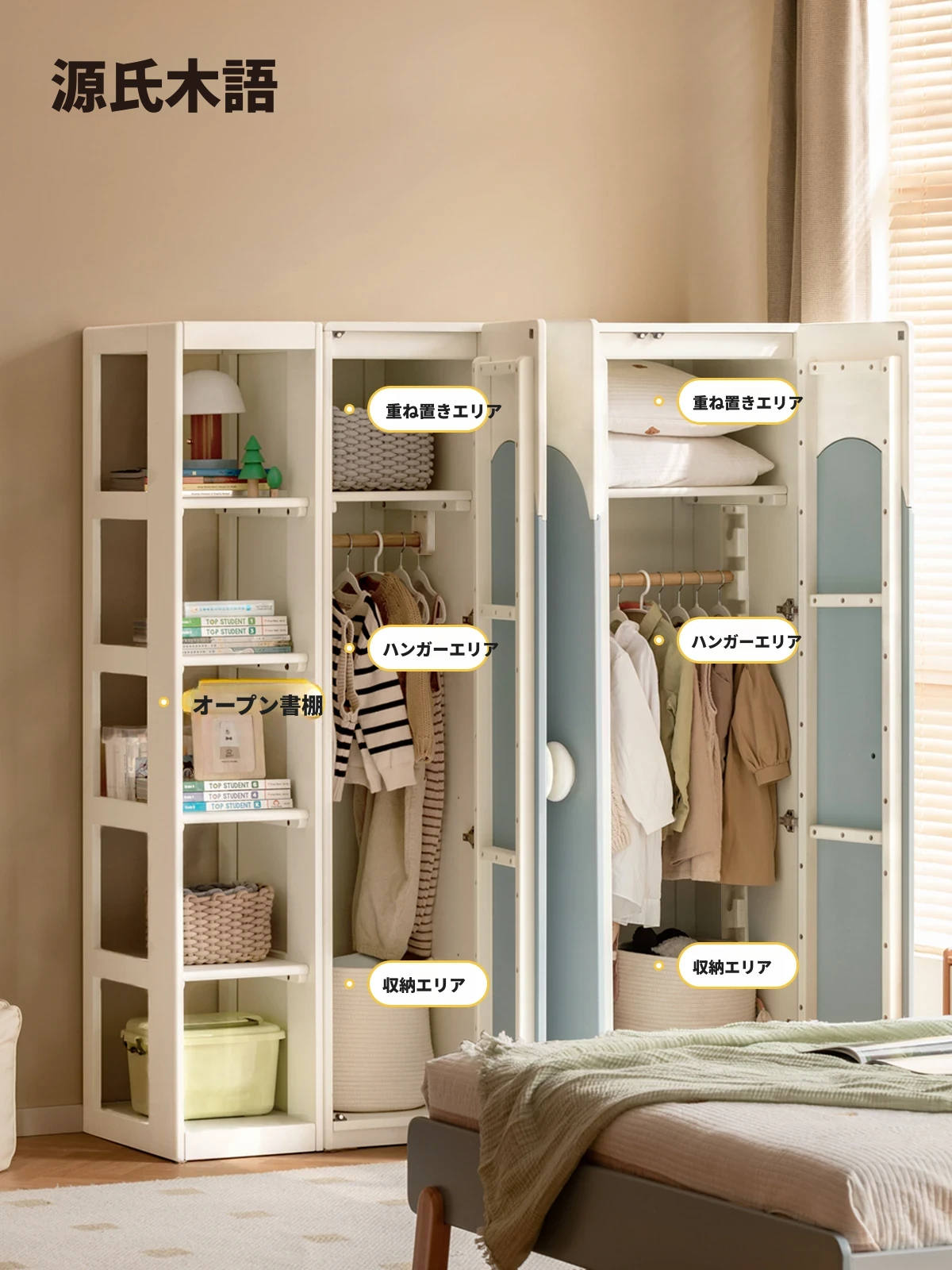 源氏木语 子供用 天然木製 スライド扉 クローゼット ベッドルーム用 おしゃれで機能的な収納家具 男の子・女の子向け 完璧な収納ソリューション