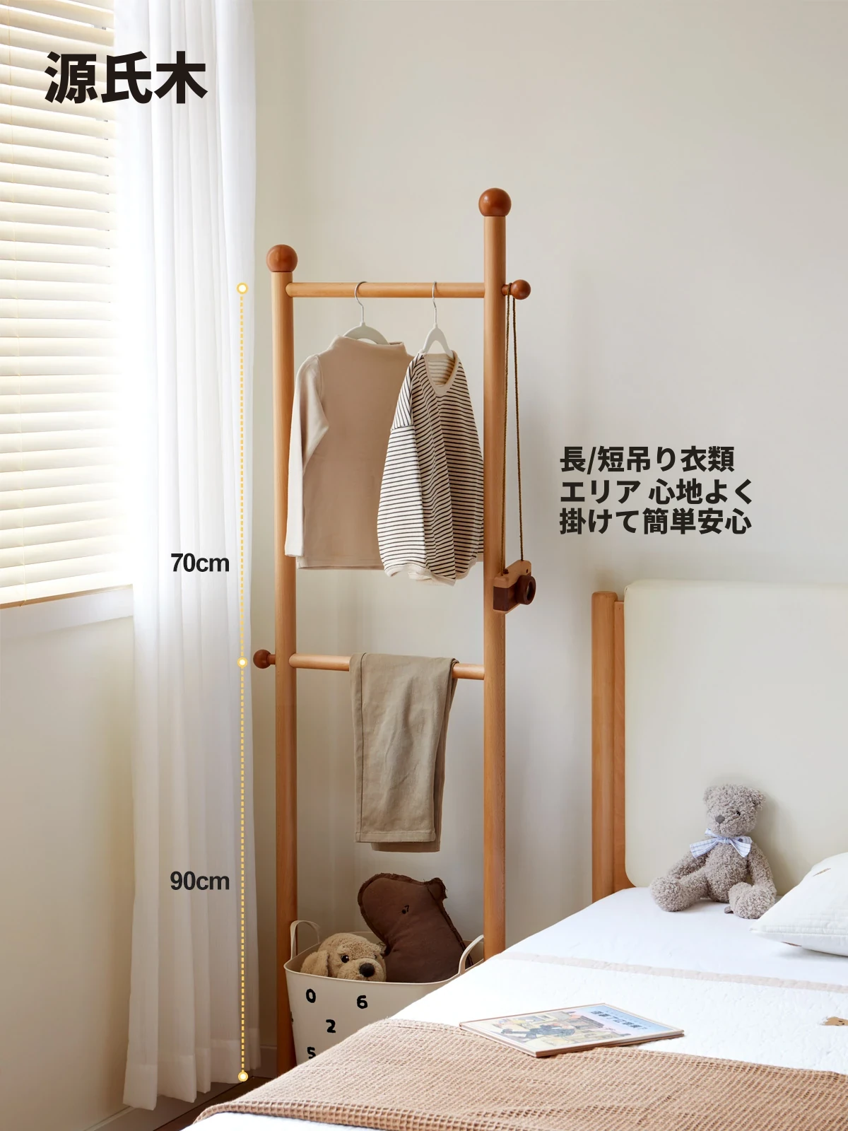 源氏木語の本格的な無垢材子供用コートハンガー - おしゃれで実用的な収納ラック、子供部屋やお家に最適!衣類を整理整頓して、楽しい暮らしをサポートします。