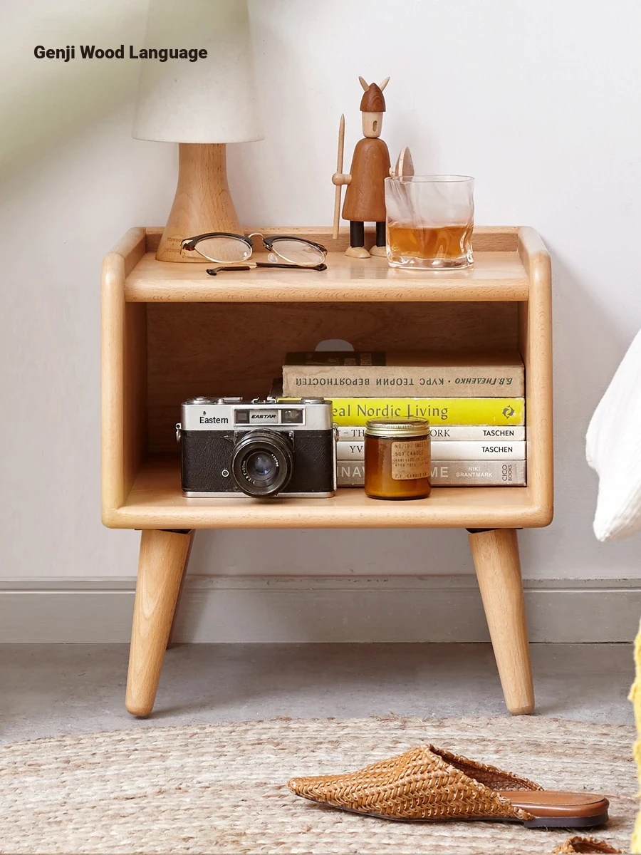 Genji Wood Natural Solid Wood Bedside Table - Minimalist Nordic Style Mini Storage Cabinet for Small Bedrooms with Pull-out Design