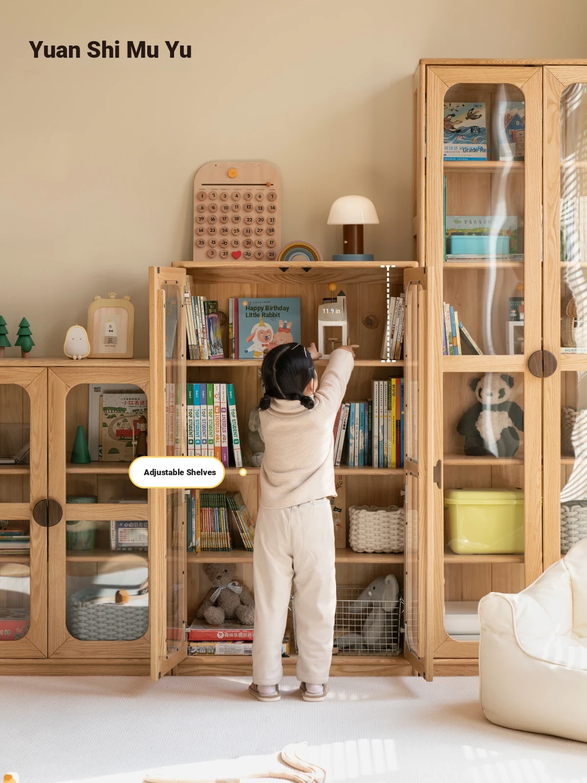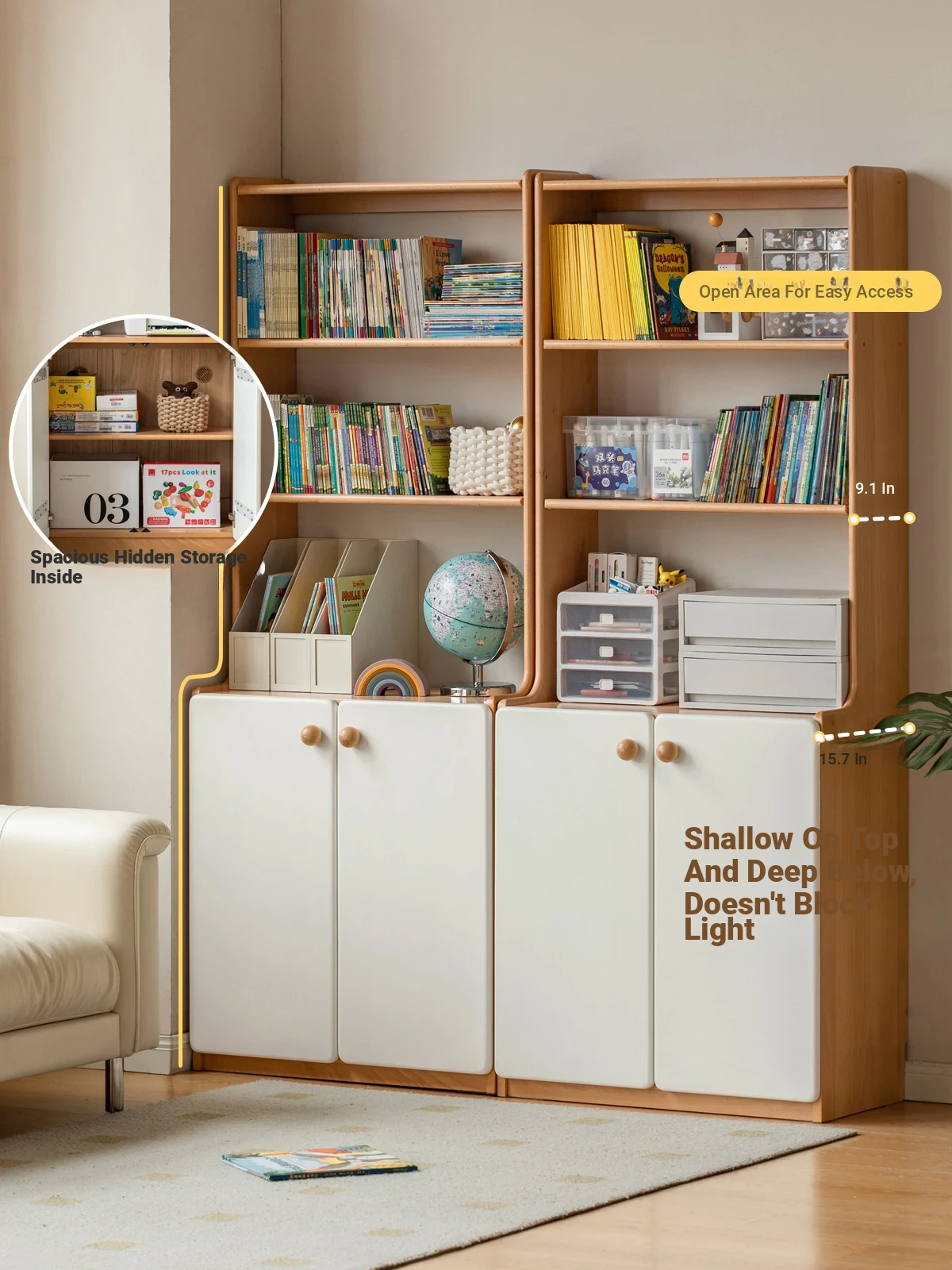 Genji Mu Yu Solid Wood Children's Bookshelf with Doors – Dustproof Floor-Standing Storage Cabinet for Reading Areas, Perfect for Organizing Books and Toys.