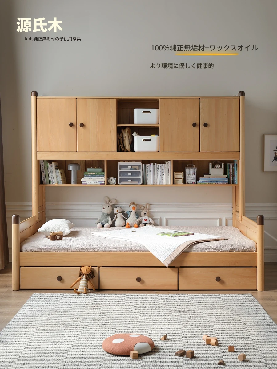 源氏木语の無垢材子供用ベッド|現代的でシンプルなデザイン、狭い部屋にもぴったり!収納機能付きの多機能一人用ベッドで、子どもの成長をサポートします。快適な睡眠空間を提供します!