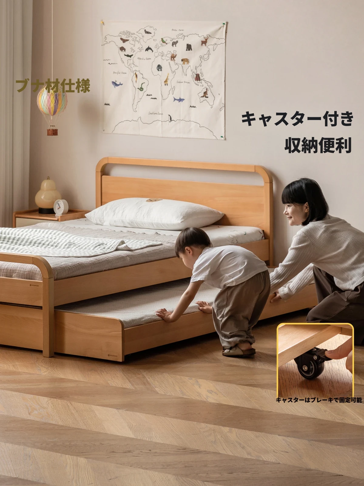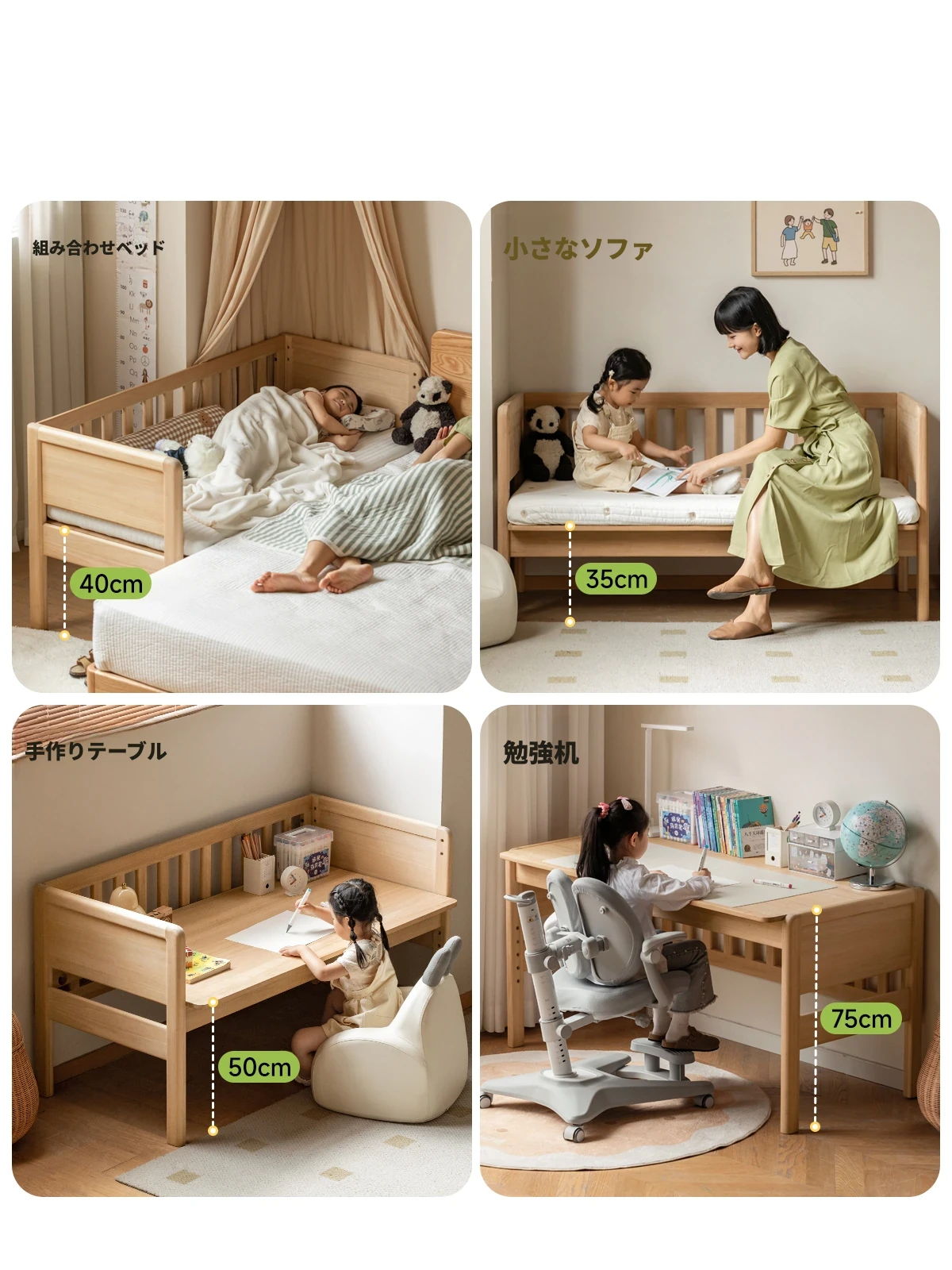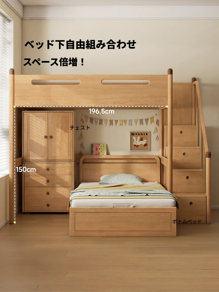 源氏木语 モダンシンプルな無垢材ベッド 多機能コンビネーションベッド 小型住宅向けの高低ベッド 子供用ベッド 自然の温もりで心地良い眠りをサポート!